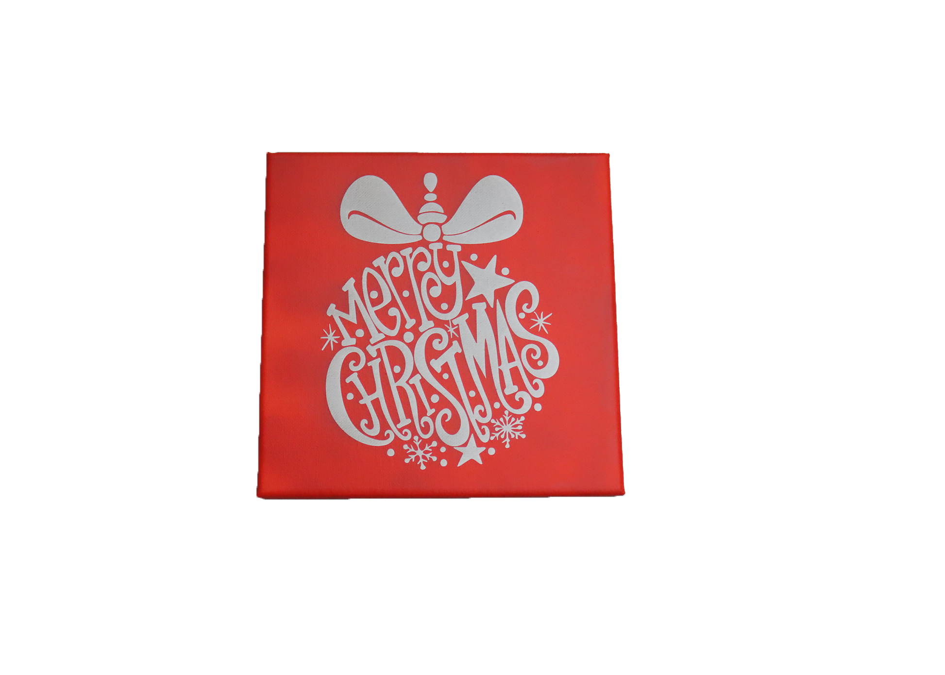 Celebrate the season with this charming laser etched 8x8 Christmas canvas. Featuring a beautifully designed ornament shape filled with festive hand-lettered "Merry Christmas" typography, stars, and snowflakes, this piece brings classic holiday elegance to any space.